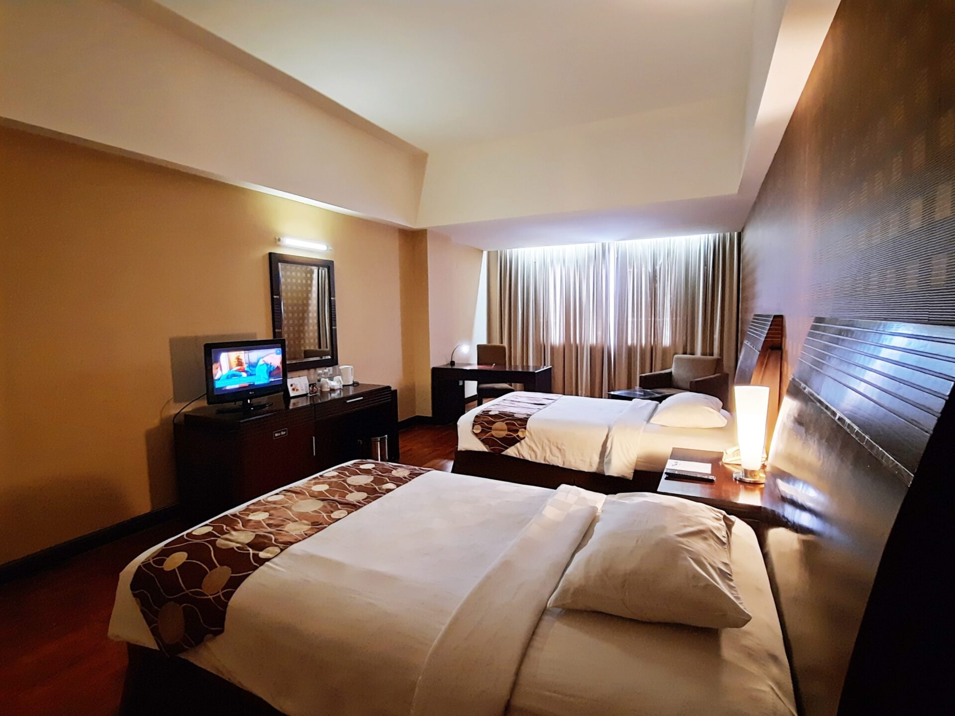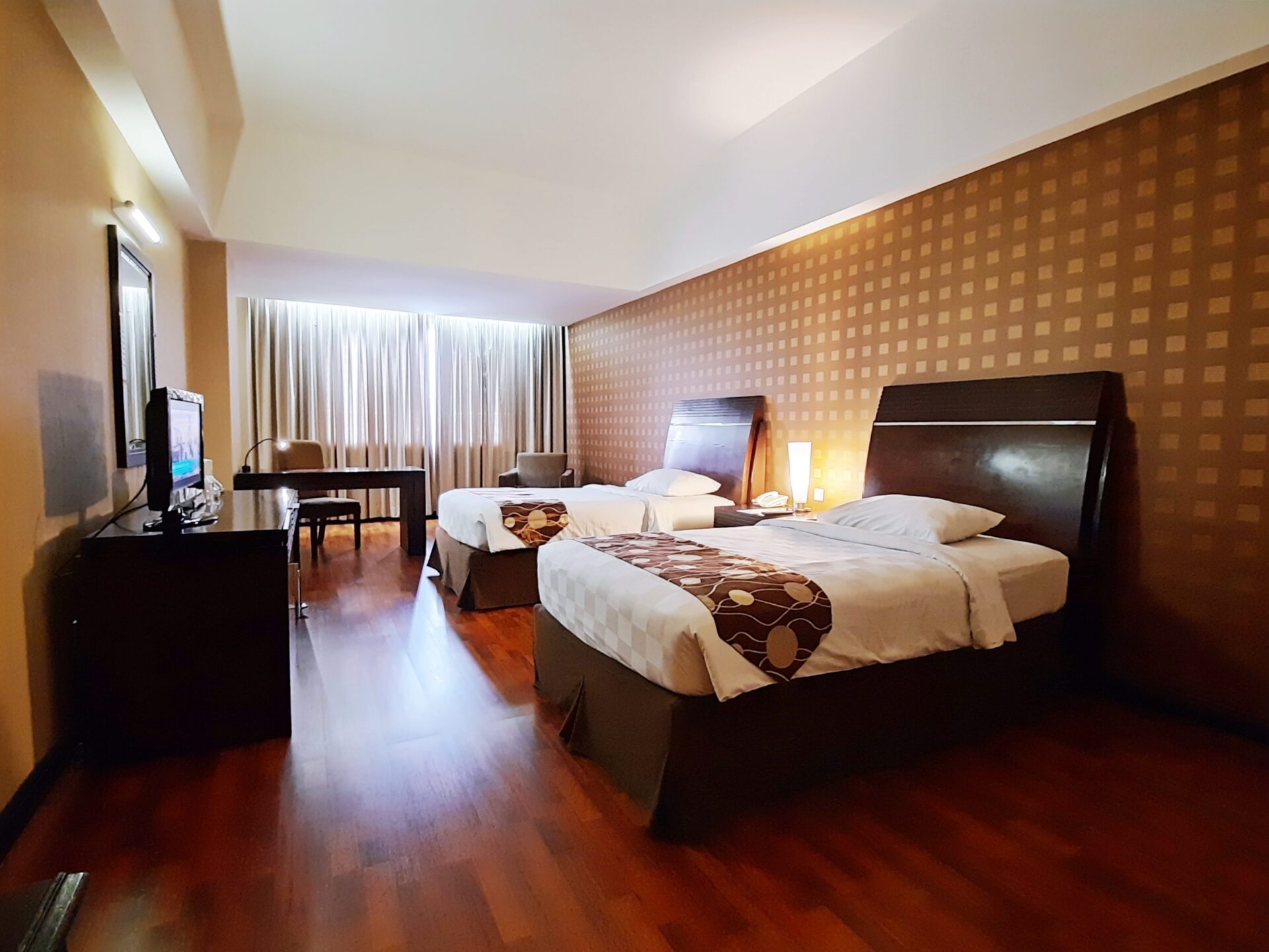 Tipe tempat tidur dapat dipilih sesuai kebutuhan, ada yang satu tempat tidur (king) dan ada yang dua tempat tidur (twin). Beberapa view untuk tipe deluxe adalah void (bagian belakang gedung) dan suasana komplek perkantoran di sekitar hotel. Luas 11,13 x 4 meter squares. Harga kamar sudah termasuk sarapan pagi untuk dua orang, gratis fasilitas di Elite Fitness Center, gratis fasilitas di Grand Spa, gratis biaya parkir dan gratis akses internet (WiFi).